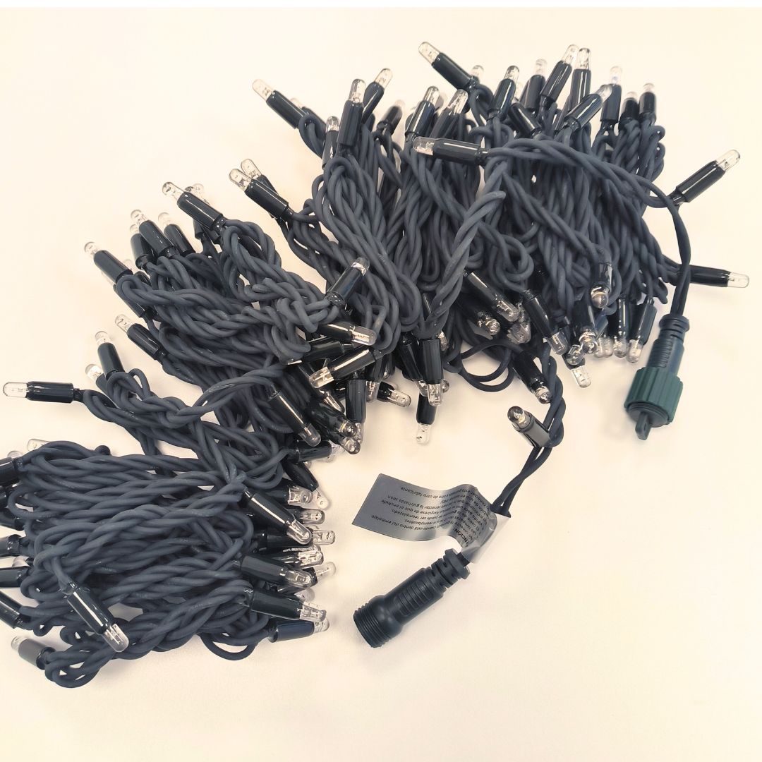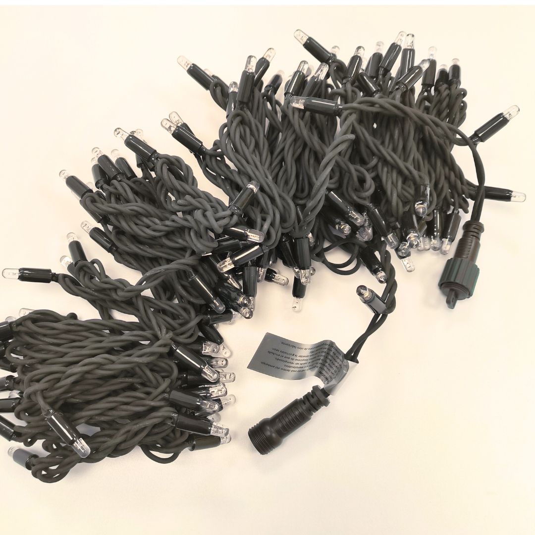 Cada LED tiene un diámetro de 0,5 cm, separados por 10 cm, montados sobre un cable resistente disponible en negro o verde. La guirnalda permite conectar hasta 10 unidades entre sí para crear instalaciones largas y continuas.