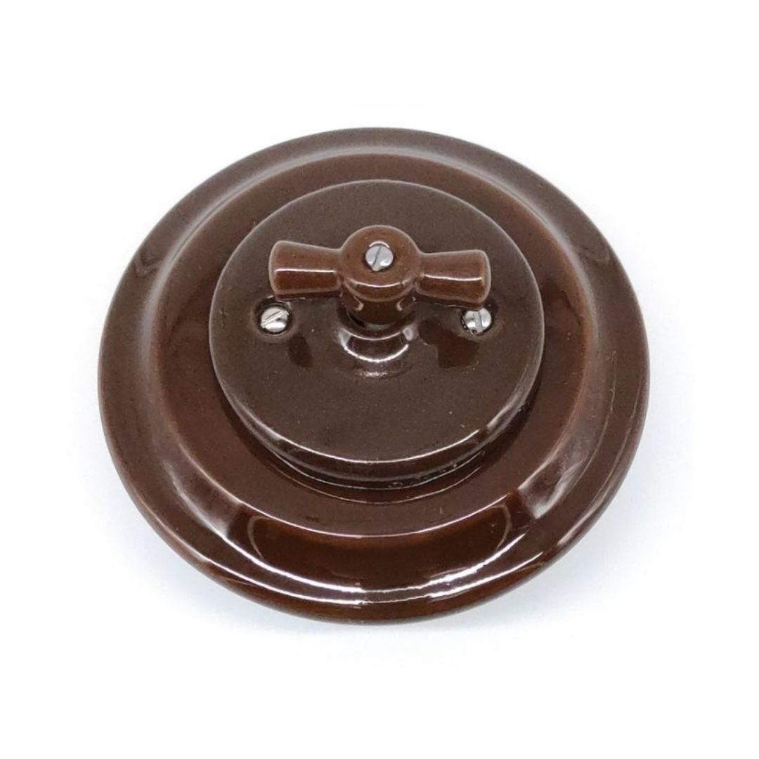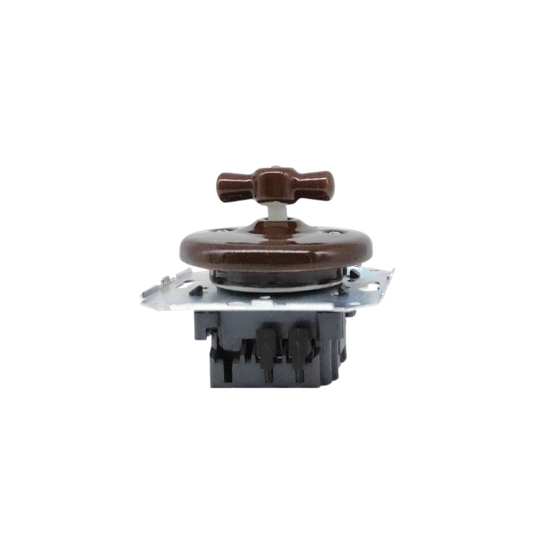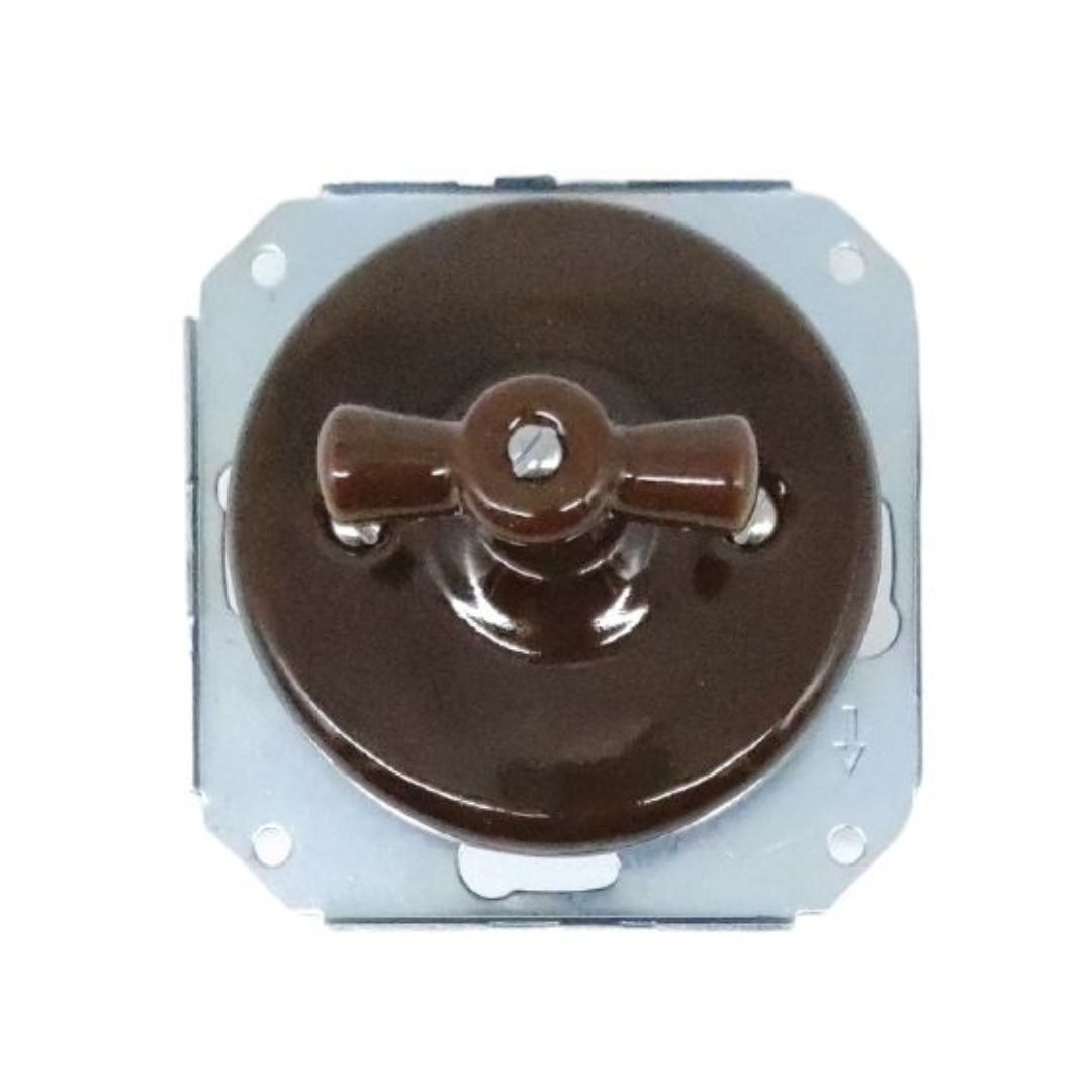 Interruptor de cruzamiento empotrable fabricado en porcelana marrón de primera calidad con lazo tradicional, ideal en la rehabilitación de antiguas viviendas como en edificios nuevos con estilo tradicional.