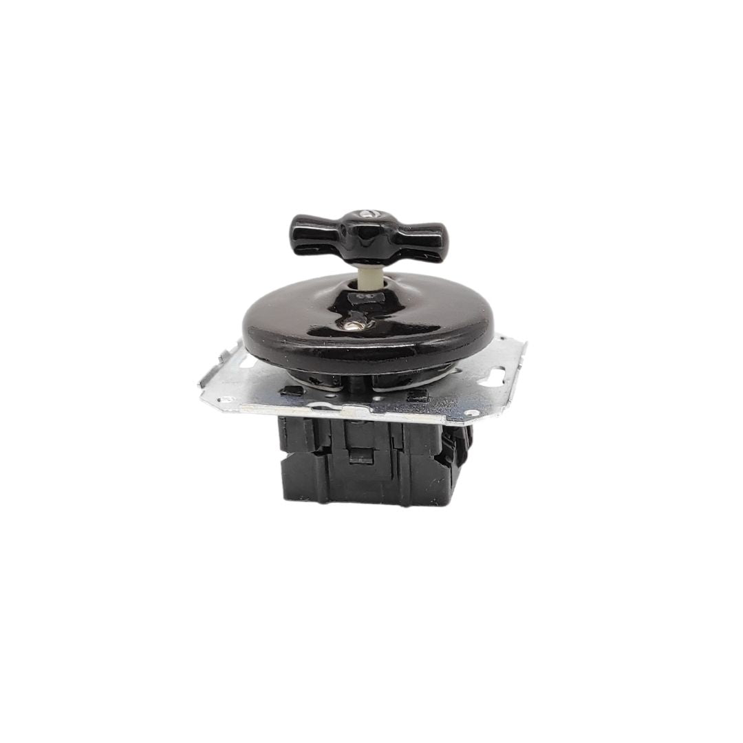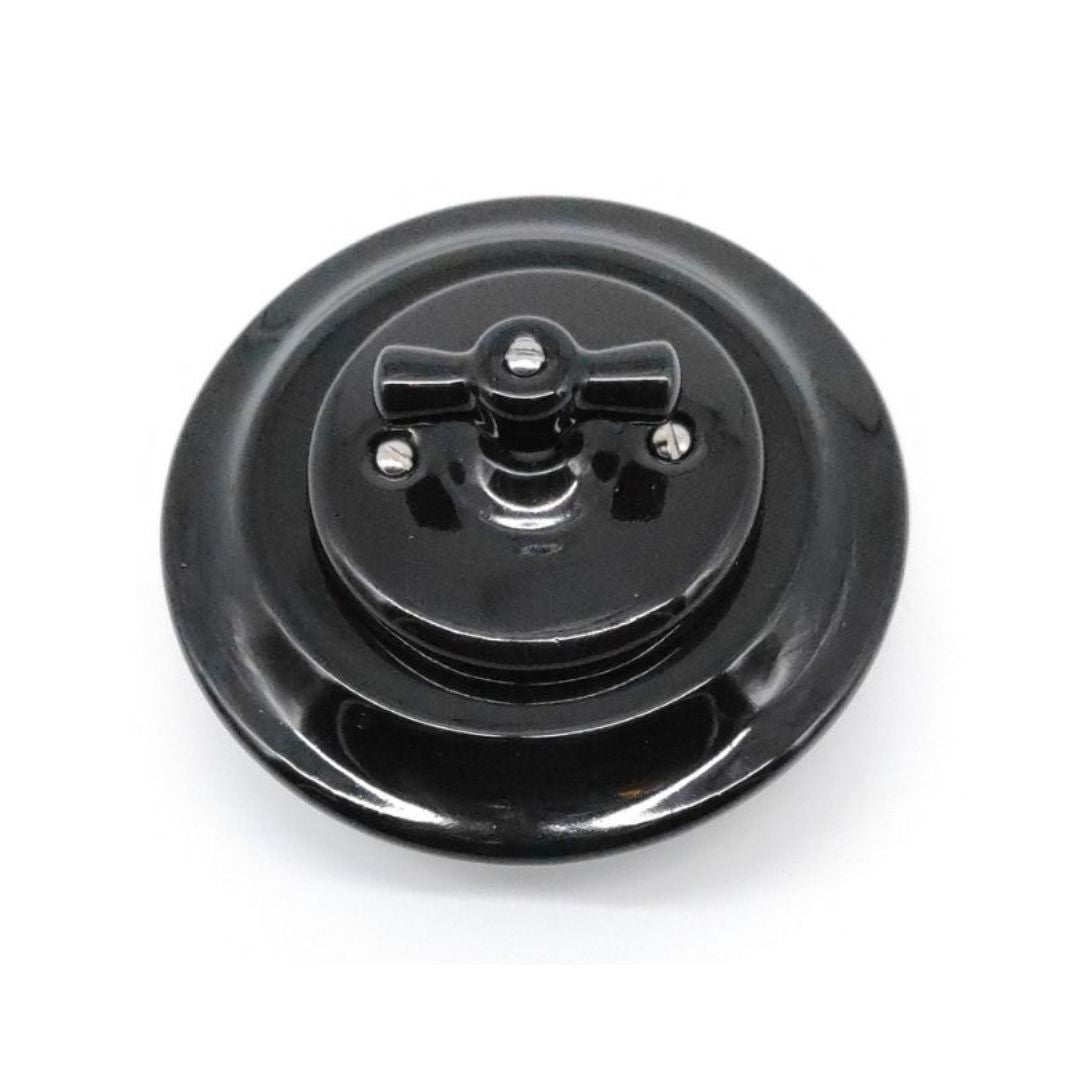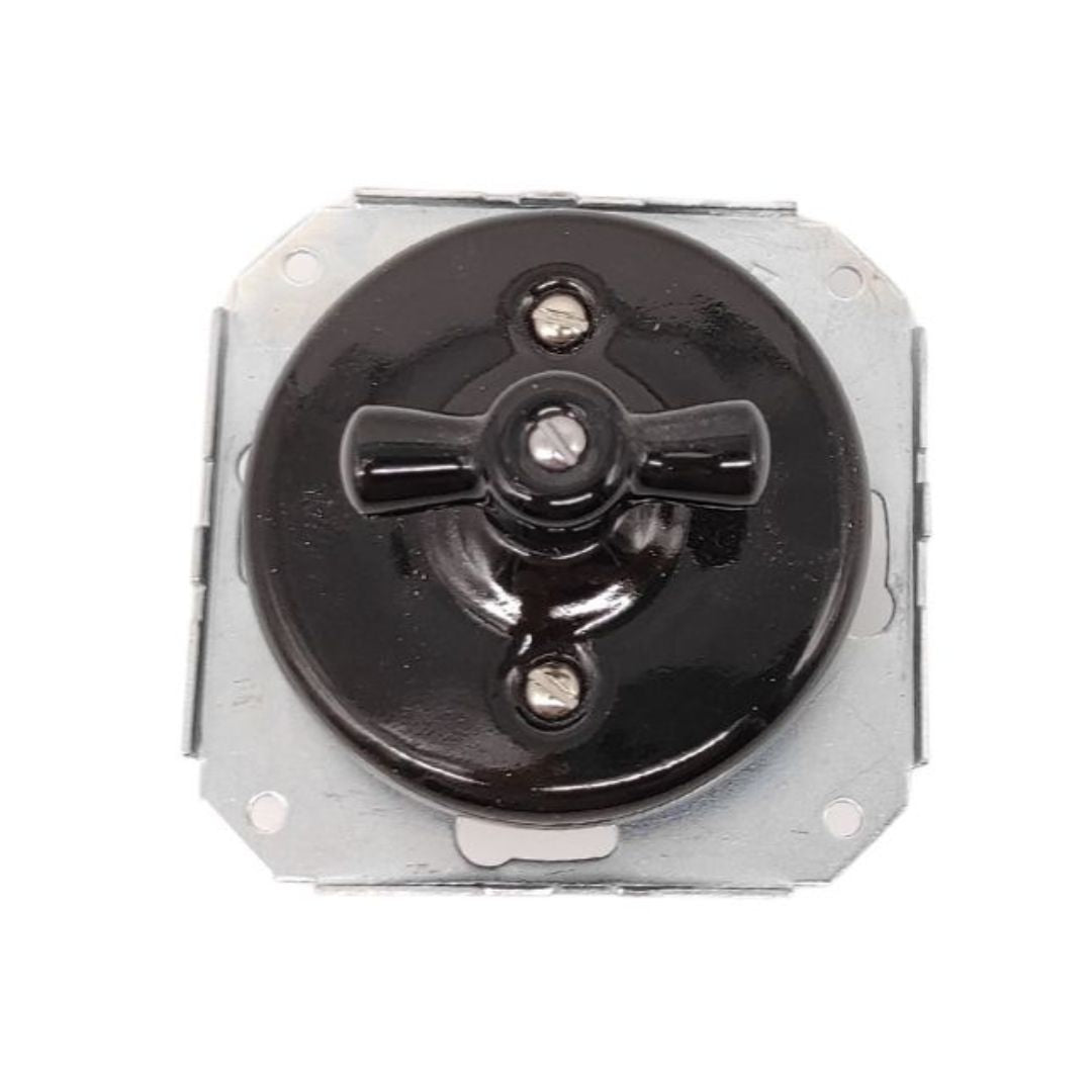 Interruptor de cruzamiento empotrable fabricado en porcelana negra de primera calidad con lazo tradicional, ideal en la rehabilitación de antiguas viviendas como en edificios nuevos con estilo tradicional.