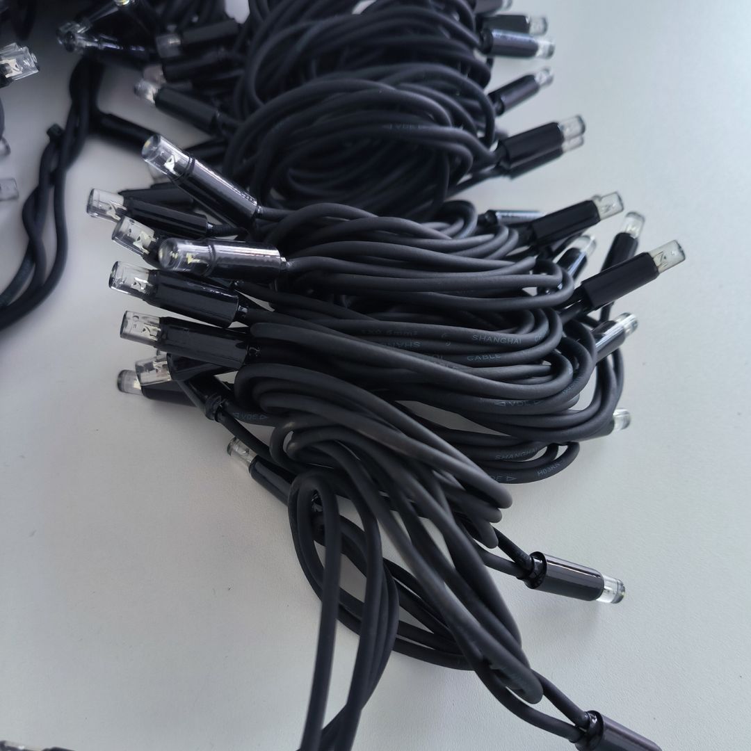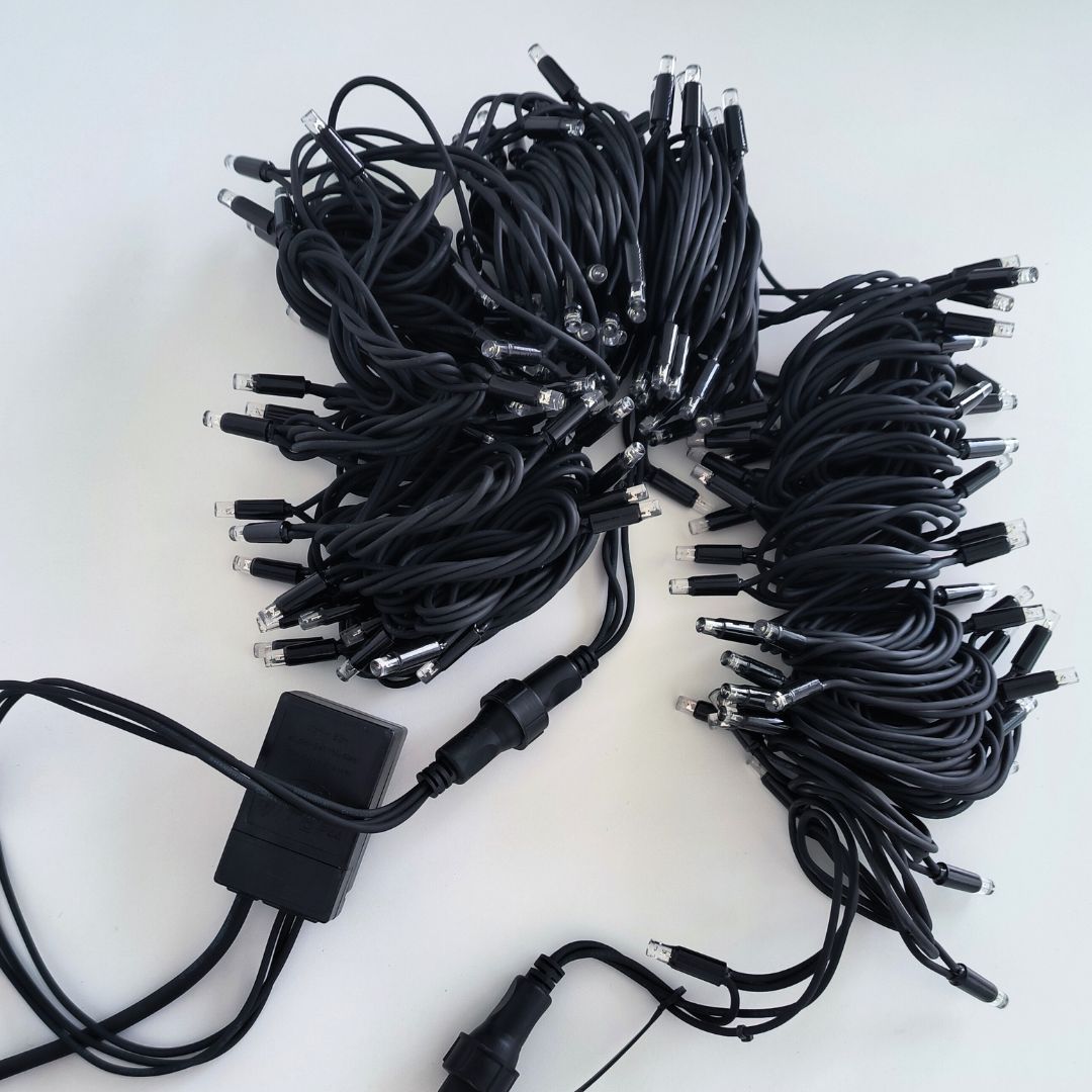 Grinalda LED feita com cabo de borracha preto, com 144 luzes LED branco quente, espaçadas de 10 cm entre si, ideal para decorar e iluminar tanto no Natal como em festas ou celebrações no resto do ano.