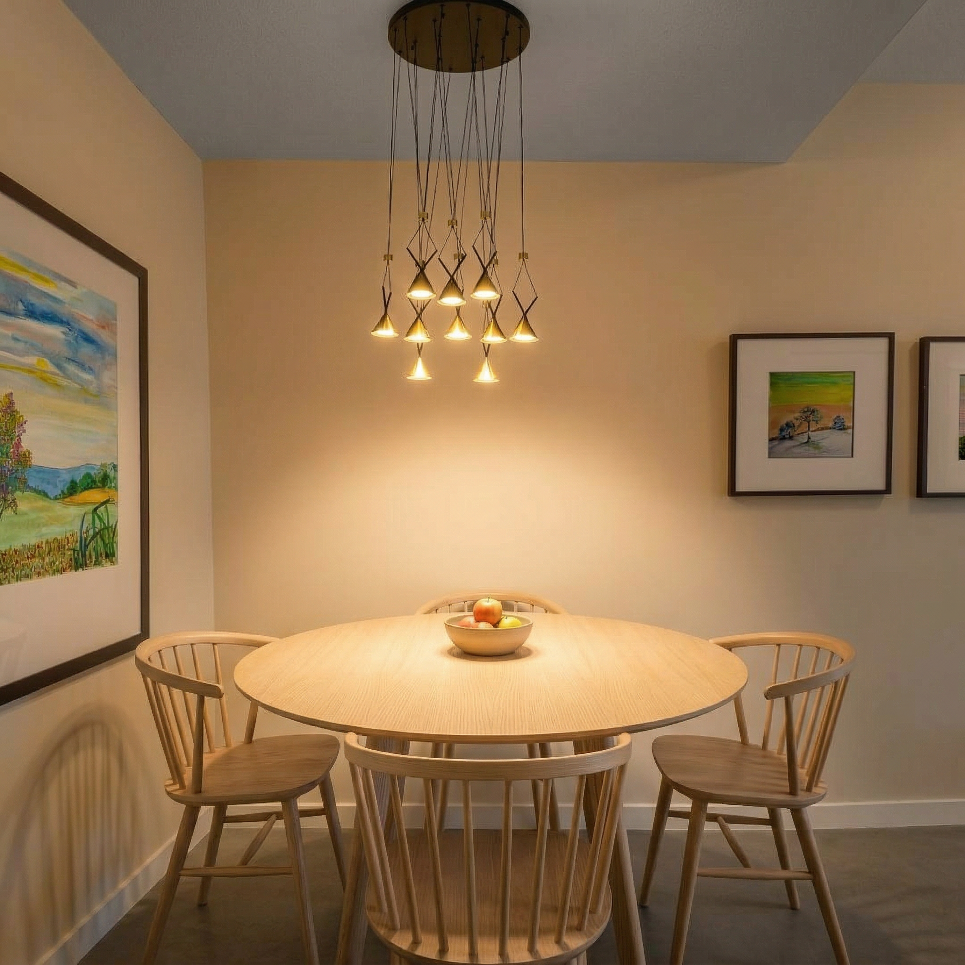 • Versatilidade e estilo: Perfeito para grandes espaços como salas de estar, salas de jantar e cozinhas, seu design suspenso com 10 focos proporciona uma distribuição de luz equilibrada e harmoniosa.