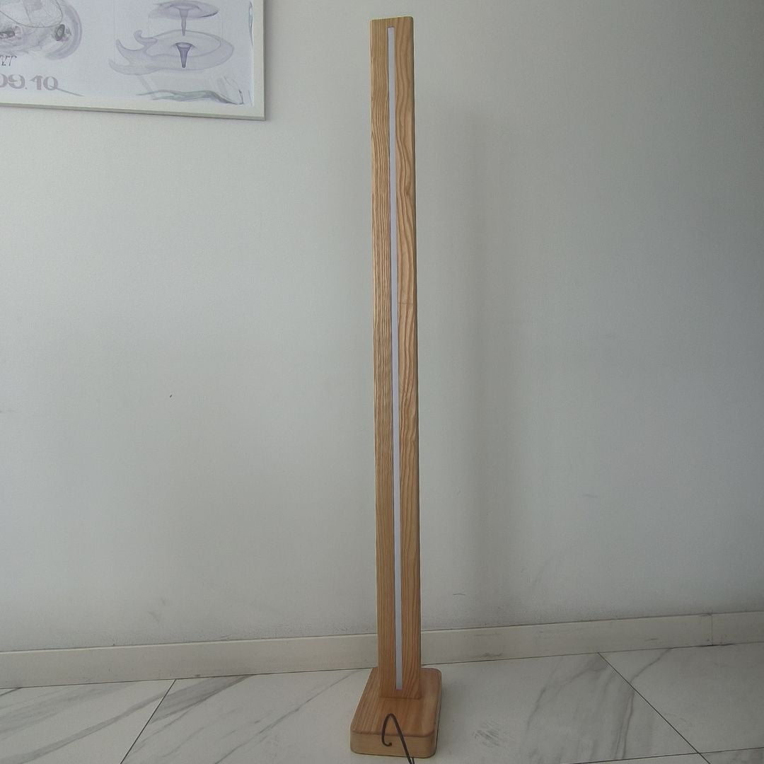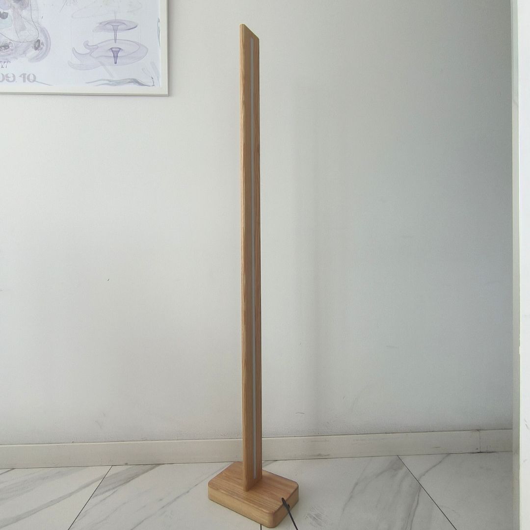 Candeeiro de pé LED, corpo em madeira de freixo sobre base retangular em madeira.
